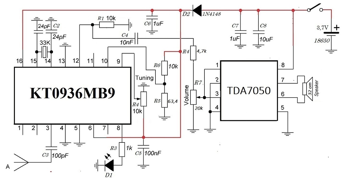 Эта схема FM радиоприемника на микросхеме KT0936MB9 мной уже неоднократно собиралась, и показала себя с самой положительной стороны, только до этого в качестве УНЧ я применял микросхему 8002B, а в этот раз, ввиду того что у меня в наличии имелся динамик, который штатно становился в приемник Зорька с сопротивлением катушки 32 Ом, в качестве УНЧ пришлось использовать микросхему TDA7050, включённую по мостовой схеме.