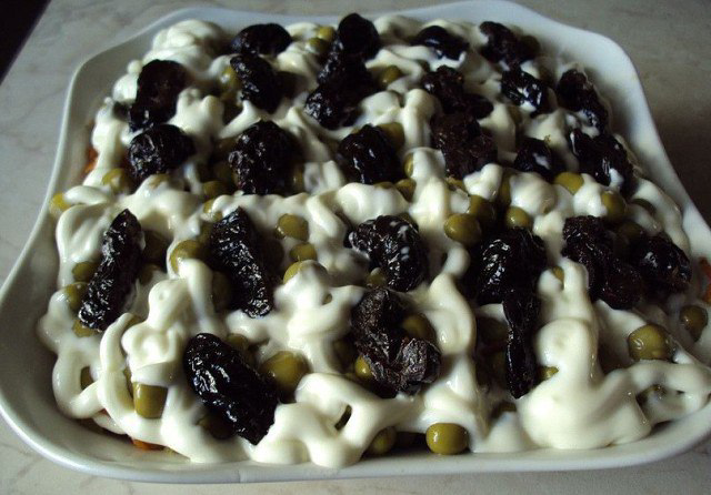 попробуйте не пожалеете!!! Ингредиенты: 200-250 грамм отваренного филе курицы консервированный зеленый горошек нарезанные соломкой маринованные огурцы обжаренная на растительном масле нарезанная соломкой морковь 3 вареных яйца 10 штук чернослива без косточек лук репчатый 1 шт майонез Приготовление: Мясо разделить на волокна . Яйца натереть на крупной терке . Лук нарезать полукольцами и замариновать на 20 минут в смеси уксуса с водой. Чернослив залить на 10 минут кипятком и нарезать на 4 части. Салат выложить слоями,промазывая майонезом. Очередность : Курица,лук,яйца,огурцы,морковь,горошек. Верх украсить сеточкой из майонеза и черносливом.