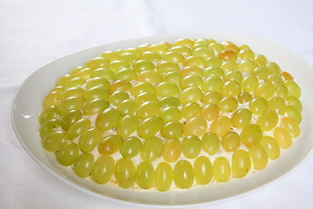 НАМ потребуется: На 6 порций. · Грудка куриная – 350 г · Виноград – 250 г · Сыр твердый – 80 г · Орехи грецкие – 40 г · Яйцо куриное – 3 шт. небольшие · Майонез – 70 г · Йогурт – 70 г · Карри – 1 ч.л. · Соль – по вкусу · Масло растительное – 1 ст.л. · Яблоко – по желанию небольшое · Яйца небольшие 3 шт. Отварить их вкрутую. Виноград лучше взять без косточек и обязательно сладкий. Грецкие орехи слегка обжаренные. Курицу посолить и присыпать приправой карри. Если есть время, то дать курице промариноваться пару часов. В сковороду налить масло, обжарить филе с двух сторон, затем закрыть крышкой, убавить огонь и довести филе до готовности. Остудить. Грецкие орехи измельчить в блендере или мелко нарезать. Не в пыль, должны остаться небольшие кусочки. Курицу порезать кубиком, около 1 см. Отваренные яйца потереть на терке. Сыр потереть на мелкой терке. Йогурт смешать с майонезом. Собираем куриный салат с виноградом Тиффани. На дно тарелки выложить курицу, смазать 1/3 смеси майонез+йогурт. Прис