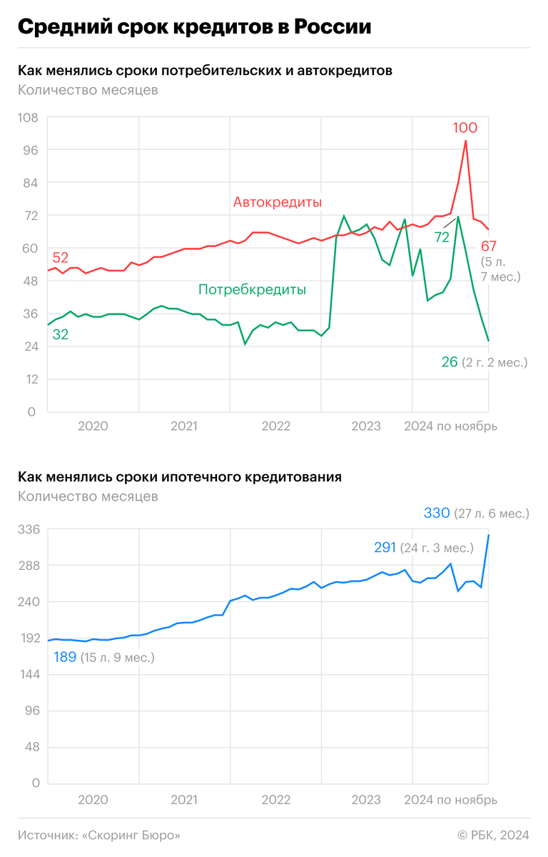 Средний срок ипотечных кредитов аномально вырос: если в конце 2023 года он составлял 24 года 3 месяца (291 месяц), то к ноябрю 2024 года — 27 лет 6 месяцев. Это следует из данных «Скоринг Бюро», которые изучил РБК.