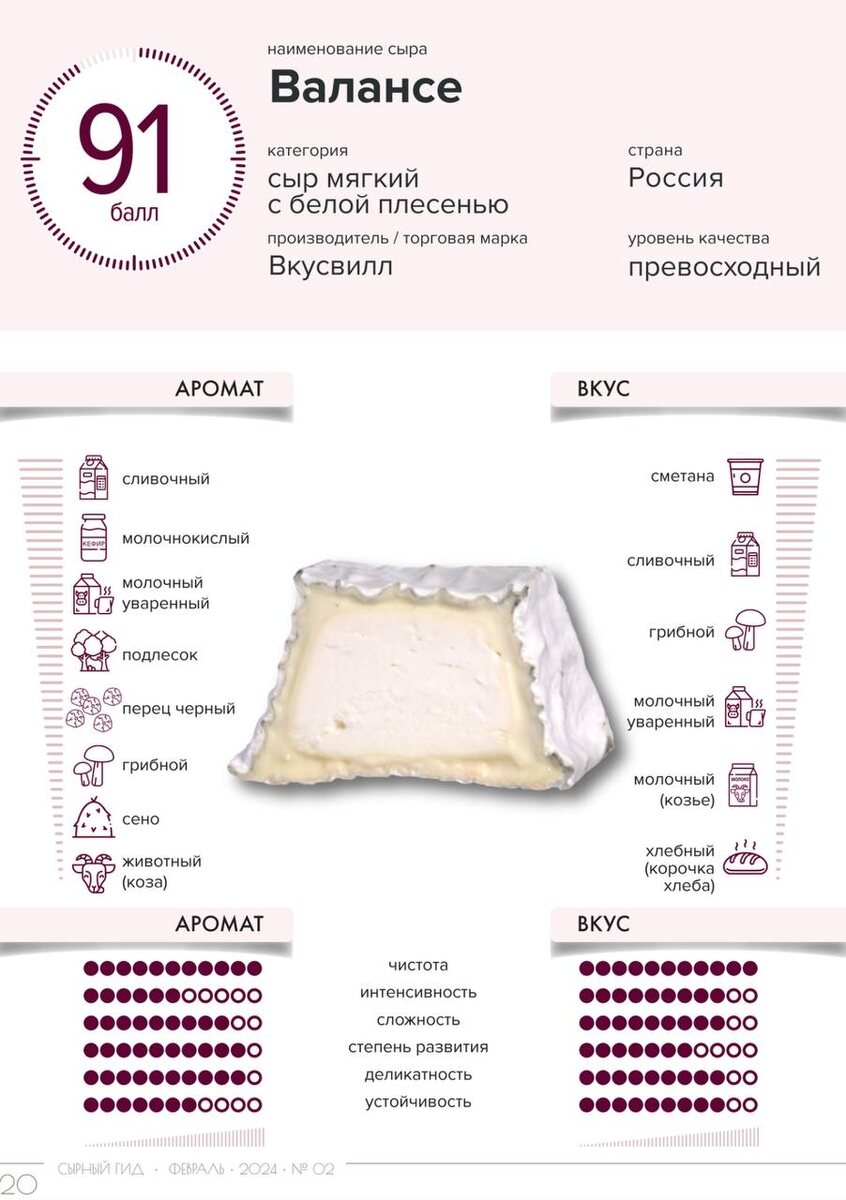 В магазинах "ВкусВилл" большой ассортимент сыров. Напрашивается вопрос: какой выбрать? В рамках журнала "Сырный гид" мы попробовали разные образцы из этого супермаркет. Делюсь своим мнением с вами! Отличный образец сыра валансе - сливочный, жирный, объемный и слегка пикантный вкус, в послевкусии - яркая коза. Сложный ароматический профиль и отличный вкусовой баланс. Хорошо проявит себя в составе сырной тарелки. По ароматическому и вкусовому профилям - очень удачный образец сбалансированного сыра, к которому хочется добавить дополнительных ингредиентов. Послевкусие сыра объемное, сливочное. Варианты употребления - самостоятельно, в холодных блюдах, брускеттах. Интересный образец сыра со сложным ароматическим и вкусовым профилями, хорошим вкусовым балансом, твердой и ломкой консистенцией. Сыр для расширения состава сырной тарелки, использования в холодных блюдах. Сыр с классическим ароматическим и вкусовым профилями, характерными для бри. Несмотря не нехватку жирной составляющей во вкус