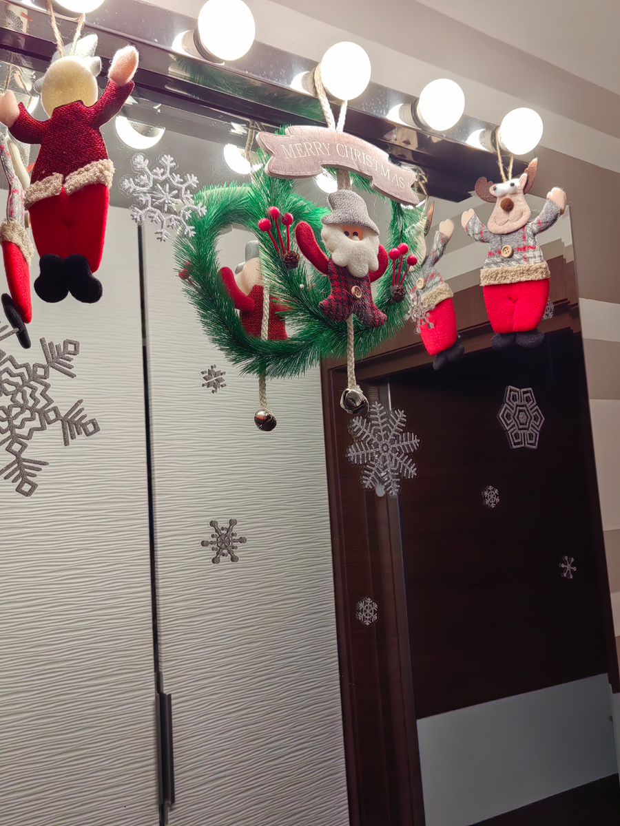 По-нормальному повесился повис только центральный чел – типа Санта, два других – лось (справа) и снеговик (слева) – походу, так долго (год!) лежали в шкафу, что страшно соскучились и никак не хотели висеть ровно, всё время разворачивались друг к другу лицом)). Решила: пусть пока так висят. Потом отутюжу им петли. Ибо нефиг.
