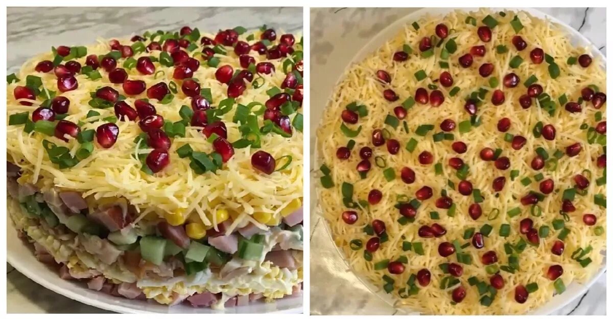Ветчина — 200 гр.;копченый свиной ошеек — 200 гр.;копченое куриное филе — 200 гр.;огурец свежий — 1 шт.;консервированная кукуруза — 150 гр.;сыр твердый — 100 гр.;яйца — 4 шт.;зеленый лук — по вкусу;немного зерен граната;соль, перец — по вкусу;майонез — по вкусу.