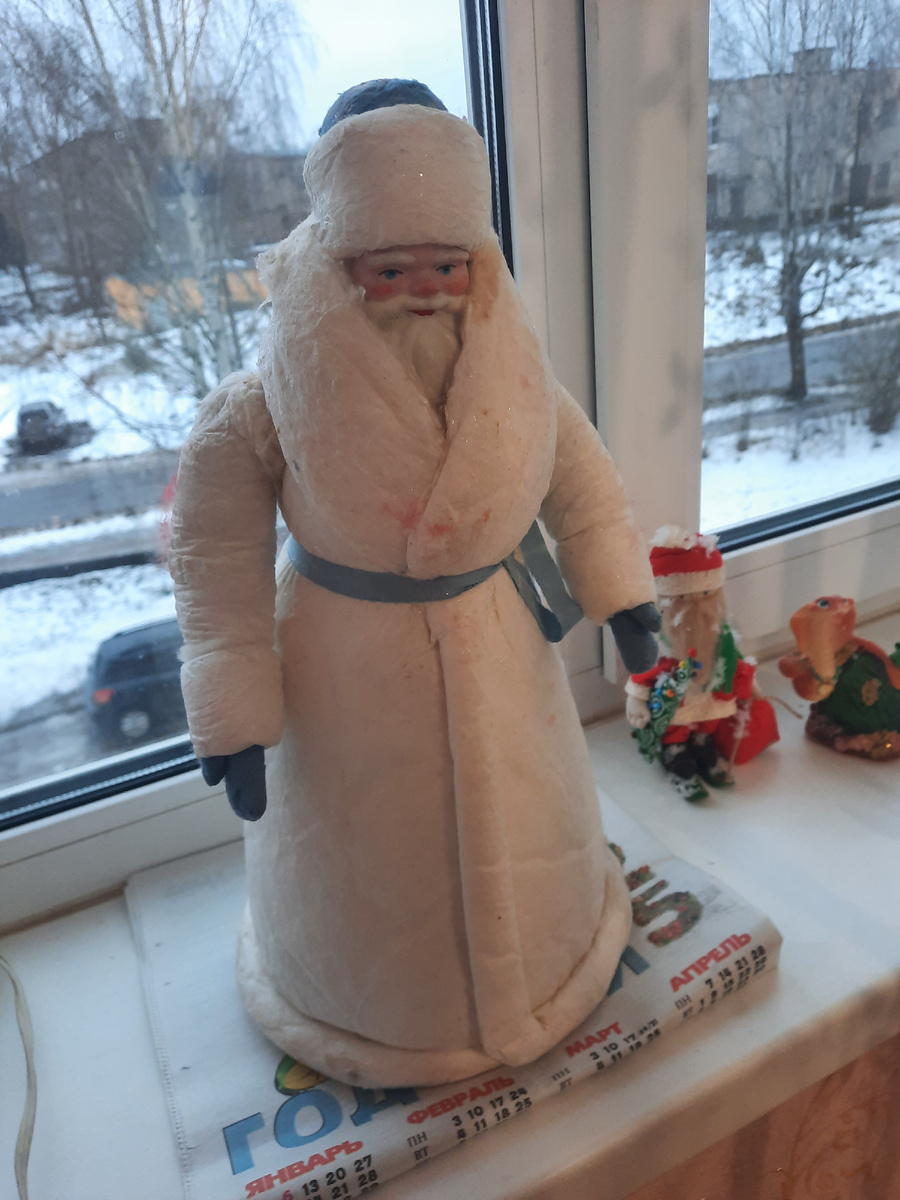 Вот Дед Мороз! На столе стоял, это уже мы переставили, стол понадобился. Рядом ветка еловая огромная стояла с игрушками, да мама ее убрала быстро, не успела зафиксировать. Иголки посыпались.