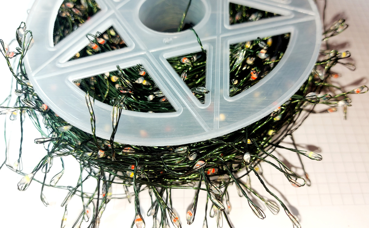Иногда возникает потребность в гирлянде "нить росы" у которой диоды расположены чаще чем через стандартные 10см. В этом случае простейшее решение сложить нить вдвое/втрое/вчетверо и немного скрутить... Главное приобрести нить с запасом длины.