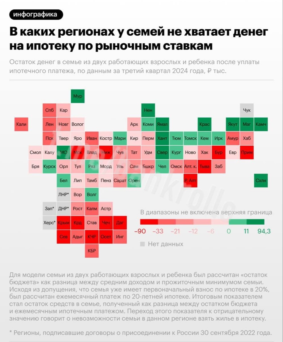 Да! вы не ослышались ипотека в России стала на столько высокой по процентам и по оплате в месяц, что большинство не могут платить в месяц сумму 135–157 тыс. руб. Ладно там с оплатой в месяц, а как же проценты по ключевой ставке 21%! В ряде регионов дефицит необходимого дохода за месяц превышает 100 тыс. руб, что тоже включалось в статистику при учете. Семья, состоящая из двух работающих взрослых и двух детей, не может себе позволить ипотеку по рыночной ставке в 83 из 85 регионов, следует из мониторинга доступности жилья в субъектах Российской Федерации за третий квартал 2024 года Ранее были льготные условия, та же IT-ипотека 6% с первоначальным взносом. Сейчас же все льготы убрали и стали делать процент по ключевой ставке. Это стало проблематично в наши реали. Ниже я прикреплю фото с статистикой по всем регионам. Повышения стоимости на жилье причем не только в Москве, но и в других регионах. Только делает хуже и проблематичней для обычного жителя нашей страны. Уровень дохода не може