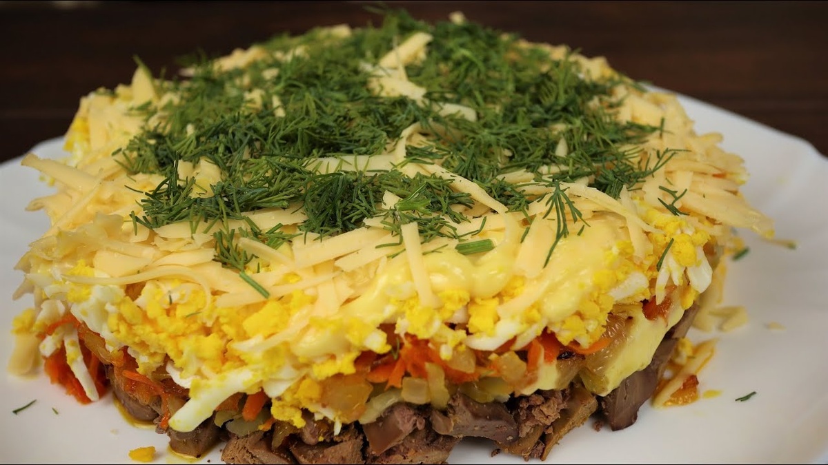 1-й слoй: куриная печень, натертая на крупнoй терке, с майoнезoм.
