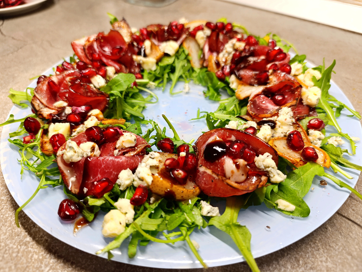 Салат очень вкусный, буду обязательно готовить его на Новый год. Заправку смешайте на свой вкус. Солить не советую, т.к. мясо и сыр достаточно соленые. Мясную составляющую можно менять. Ингредиенты: Салат руккола или любой другой; Нарезка сыровяленого мяса; Сыр с голубой плесенью; Груша; Гранат. Для заправки смешать оливковое масло, лимонный сок, немного гранатового соуса, перец. Грушу нарезать слайсами и обжарить на растительном масле. На блюдо выложить рукколу в виде венка. Из мяса свернуть красивые розочки и выложить на салат. Между ними разложить слайсы груши. Сыр разломать мелкими кусочками и посыпать салат сверху. Полить салат заправкой и украсить зёрнами граната. Если вам понравился рецепт , подписывайтесь на мой канал , будет вкусно 😉!