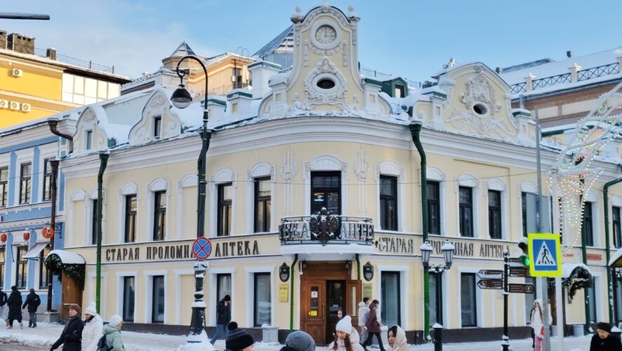 Если вы прошли всю Баумана от Кремля и вам нужно погреться, или только начинаете прогулку, подъехав к «казанскому Арбату» со стороны Кольца, в любом случае нужно зайти в аптеку на углу с улицей Университетской. Экскурсоводы возле этого здания с надписью «Старая Проломная аптека» часто рассказывают про дореволюционное название пешеходной улицы — Большая Проломная.