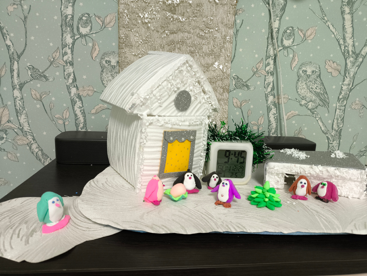 В прошлой серии пингвиньего адвента вы стали свидетелями воссоединения семьи пластилиновых пингвинов и радостно признали, что Новый год надо праздновать, чтобы были чудеса. А теперь давайте наблюдать, как это волшебство придёт на нашу льдину! Ёлка появилась, часы есть. Пора? Но я же обещала, что будет любовь? Значит будет! Смотрите! Кто это бороздит просторы комода океана? Высокий юный зелёный пингвин! На настоящем сёрфе! Была идея слепить голубого, но подумалось, что нынче это не скрепно. Юный красавец запрыгнул на большую льдину и представился. Оказалось, что это пингвин Пётр. История Петра тронула всех. Он, как и Сёма, вылупился на льдине один-одинёшенек. И кто его мама и папа не знает, никто его не спас и не нашёл. Пётр сам научился ловить рыбу и нашёл вот этот розовый сёрф. Несколько лет Пётр не знал, что кроме него есть другие пингвины, пока не заметил прекрасную Мики. Каждый день Мики плыла куда-то на своей льдине, а поздно вечером возвращался. Пётр не решался подплыть к н