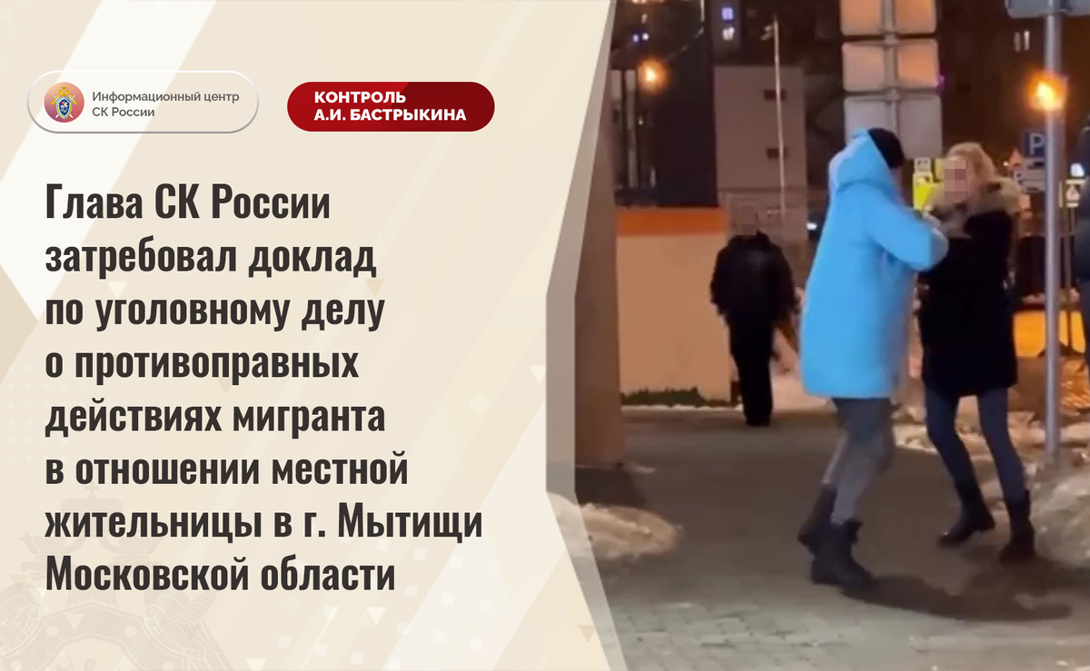 Глава СК России затребовал доклад по уголовному делу о противоправных действиях мигранта в отношении местной жительницы в г. Мытищи Московской области В телеграм-канале сообщается, что 27 декабря текущего года на улице Рождественской в городе Мытищи Московской области в ходе словесного конфликта мигрант ударил местную жительницу, высказав в ее адрес оскорбления. Также фигурант напал на мужчину, заступившегося за пострадавшую. В ГСУ СК России по Московской области по данному факту возбуждено уголовное дело по ст. 213 УК РФ (хулиганство). Председатель Следственного комитета Российской Федерации Александр Иванович Бастрыкин затребовал у и.о. руководителя ГСУ СК России по Московской области Ярослава Александровича Яковлева доклад о проведенном по уголовному делу комплексе следственных действий и установленных обстоятельствах. Исполнение поручения поставлено на контроль в центральном аппарате ведомства. #СледственныйКомитет #СКРоссии #СКР #ИЦСКР #ИнформационныйЦентр #АлександрБастрыкин #Пре