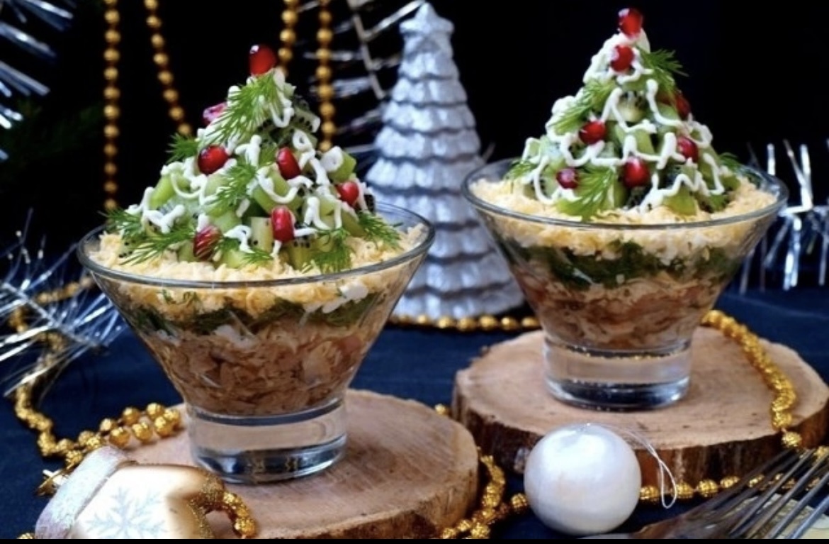 Смотрится очень красиво на столе, сразу создавая новогоднее настроение. Ингредиенты: Куриное филе — 150 г; Помидоры свежие — 2 шт; Яйца варёные — 2 шт; Укроп свежий — 0.5 пуч.; Лук фиолетовый — 1 шт; Сыр твёрдый — 60 г; Майонез (по вкусу) ; Киви — 3-4 шт; Соль, перец (по вкусу). Приготовление: Куриное филе нужно сварить заранее в подсоленной воде, остудить и нарезать кубиками. Выложить филе на дно и нанести сеточку из майонеза. Измельчить лук, натереть твёрдый сыр. На курицу выложить половину лука и затем половину сыра. Снова нанести майонезную сеточку. Нарезать мелко укроп и кубиками помидоры. Укроп выложить по краю , а помидоры в центральной части. Немного посолить и поперчить. Сверху выложить нарезанные кубиками яйца, смазать майонезом и затем оставшийся лук и сыр. Нарезать кубиками киви и выложить их горкой в форме ёлочки. Нанести штрихи майонеза, небольшие веточки укропа и украсить гранатовыми зёрнами. Приятного аппетита! 😋
