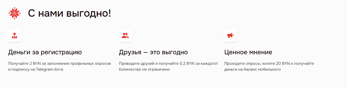 По умолчанию все опросы приходят на вашу почту. Приглашения на опросы поступают случайным образом. Бывает, что несколько раз в день, а бывает – ни одного опроса за 1-2 недели. Совет: регулярно обновляйте профильные опросы, чтобы опросы приходили чаще. В Telegram опросы приходят быстрее, подписывайтесь. Регулярно обновляйте раздел Профиль. Ваши ответы помогают нам точнее подбирать опросы. Даже незначительные изменения могут развернуть ситуацию на 180º. Мы начисляем деньги за те опросы, которые вы прошли до конца. Регистрируйтесь. Зарегистрируйтесь на сайте Opros.by и подтвердите почту. Так вы будете в курсе всего происходящего и не пропустите ничего