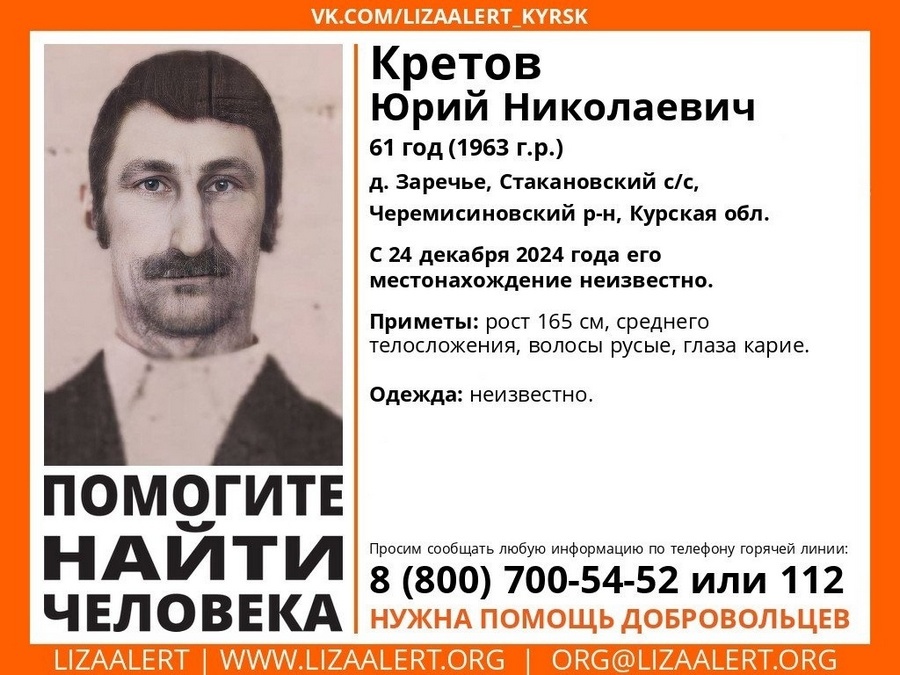 61-летний житель деревни Заречье Черемисиновского района пропал еще 24 декабря. В регионе идет его поиск. Как сообщили в волонтерском отряде «Лиза Алерт» Курской области, пропал Юрий Кретов. Его приметы: рост 165 см, среднего телосложения, волосы русые, глаза карие. В тему: Юлия КУРАСОВА Постоянный адрес новости на сайте «Друг для друга» ~ https://dddkursk.ru/lenta/2024/12/29/114901/. Новости Курска за ~ 29 декабря ~ декабрь 2024 года.