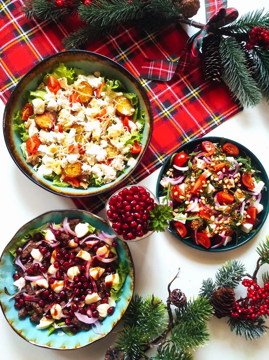 2) листья салата или пекинская капуста, обжаренная соломкой говядина, зерна граната, красный лук, шарики сыра моцарелла, бальзамический соус или гранатовый соус;