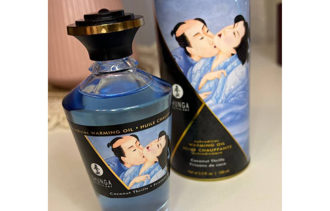 Я уже очень много всего пробовала, но всё это было больше из кинки и БДСМ-мира. А тут вдруг захотелось чего-то более нежного. Мы с мужем обсудили, что хочется какого-то мягкого и тантрического опыта. С массажем, приятной музыкой и глубоким погружением друг в друга. Для этого эротического путешествия я купила новое интересное масло от Shunga. Выбрала кокосовый вкус, потому что очень его люблю. Это разогревающее и съедобное масло для тела: меня привлекло, что его можно наносить и на слизистые - мы как раз этим и собирались заняться. Фирмой Shunga я пользуюсь давно, у меня есть от них смазка - я перепробовала много разных после того, как Swiss Navy перестали выпускать мою любимую All Natural. Shunga для меня - это про стиль и качество. У них всегда красивый дизайн упаковки, отсылки в визуале к японским гравюрам.