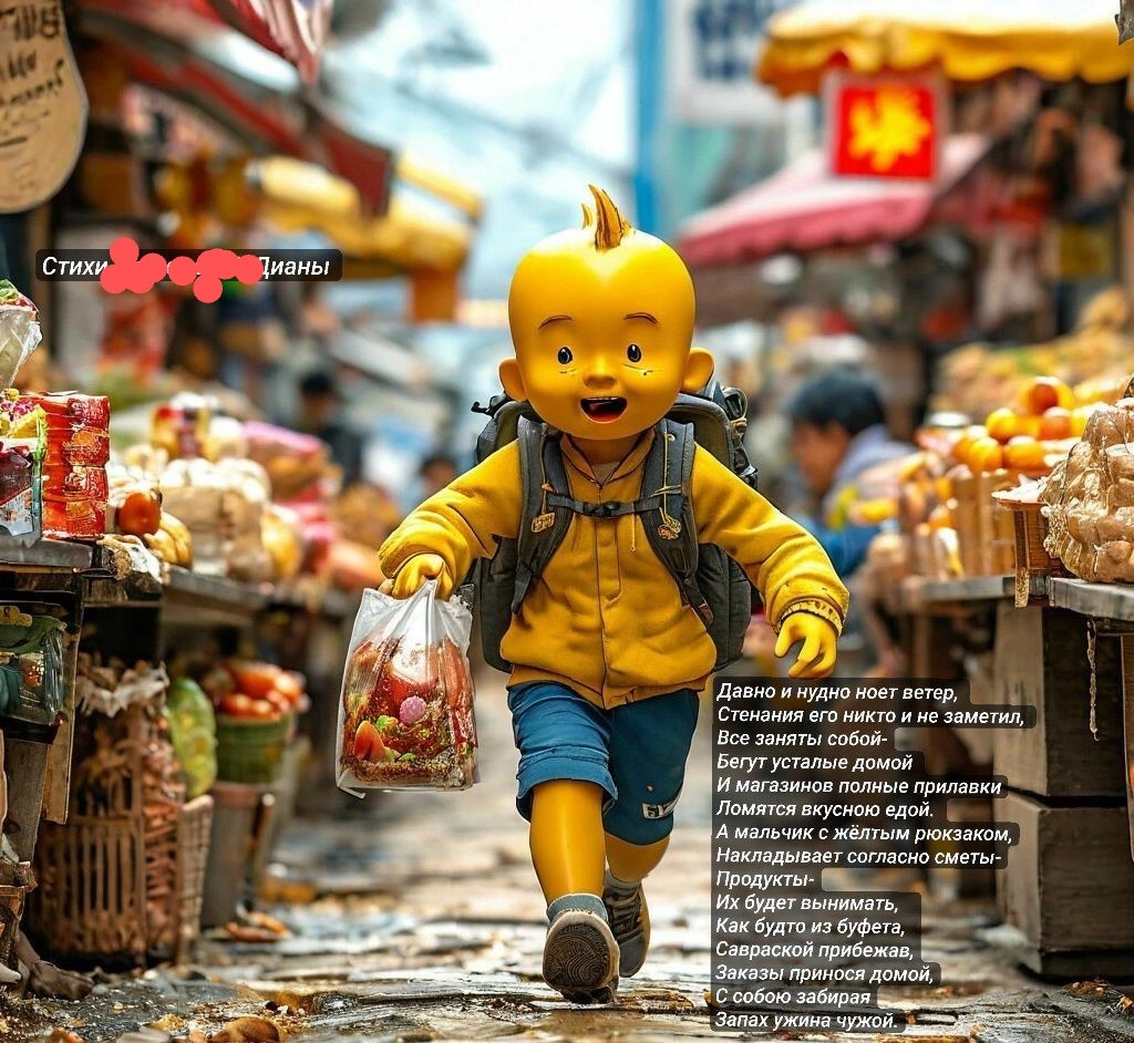 Пошныряв по своим закромам стихоблудства, решила опубликовать этот, на мой взгляд, вполне подходящий к новогодней кутерьме стих. Посвящен он был "жёлтым мальчикам", снующим туда -сюда в любое время суток, исполняющим различные пируэты в удовлетворении гастрономических изысков потребителей, то есть нас с вами. Работа суматошная, упорная, связанная с рисками коммуникаций во взаимодействии с народом, но такая незаметная, примелькавшаяся.