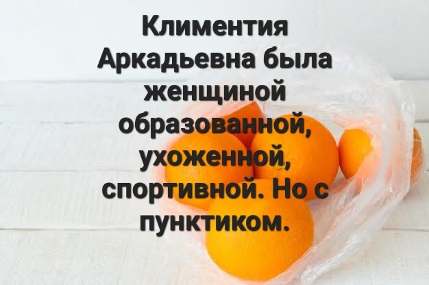 Климентия Аркадьевна была женщиной образованной, ухоженной, спортивной. Но с пунктиком. Когда-то 30 лет назад они с ее тогдашним еще супругом купили у них там в питомнике неподалеку апельсиновое дерево. Еще саженцем. Со скидкой. Климентия Аркадьевна зажглась мечтой выращивать свои собственные подмосковные апельсины. Шли годы, дерево росло, а апельсины на нем нет. Но Климентия Аркадьевна не сдавалась. Она поставила себе цель - собрать урожай апельсинов. Она упорно шла к своей цели. И удобрения заморские покупала, и от тли опрыскивала, и птиц отгоняла, и поливала, да чего только не делала. Видела цель, шла на результат. Тогдашний супруг первым заподозрил неладное и мягко попытался доказать Климентии, что дерево никогда не принесет ей плодов. Климентия обижалась, затыкала уши, называла супруга абьюзером и вечерами жаловалась на его газлайтинг Вере Петровне.