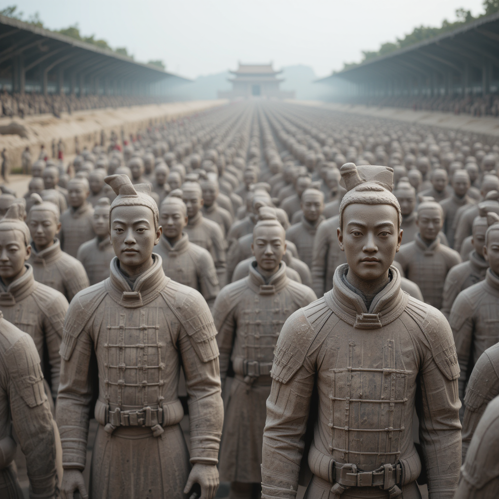 Терракотовая армия, созданная для охраны мавзолея первого императора объединённого Китая Цинь Шихуанди, является одним из самых грандиозных археологических открытий XX века. Обнаруженная в 1974 году фермерами вблизи города Сиань, она насчитывает тысячи терракотовых фигур – солдат, лошадей и боевых колесниц, каждая из которых уникальна по своему выражению и деталям. Цинь Шихуанди верил в загробную жизнь и стремился создать для себя величественное захоронение, которое обеспечит его безопасность и власть в следующем мире. Создание армии потребовало огромных ресурсов и труда: более 700 000 ремесленников и рабочих участвовали в её создании. Фигуры изготовлены из глины и обожжены при высокой температуре, что обеспечило их сохранность на протяжении веков. Каждая статуя достигает высоты около 180-200 см и отражает особенности одежды, оружия и ранговой принадлежности. Терракотовая армия олицетворяет мощь и амбиции Цинь Шихуанди, а также высокий уровень мастерства древних китайских ремесленник
