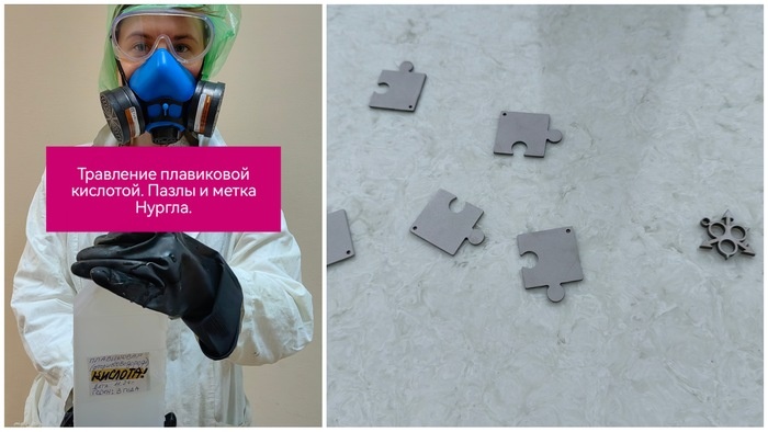 Внимание! Плавиковая кислота относится ко 2-му классу опасности. При работе с ней необходимо использовать респираторы, очки, защитные перчатки и одежду, работать в вытяжном шкафу. Травили пазлы с не самым качественным анодированием в плавиковой кислоте. В 40% кислоте титан растворился через время (примерно 10 минут). При травлении в такой концентрации титан покрывается черными пятнами. В разбавленной кислоте до 5% титан травится быстро и качественно, я просто выдерживала изделие примерно минуту, затем отправляла в емкость с водой. Получается очень хороший результат. Травила изделия поштучно. Фото в посте не так много, так как не хотелось отвлекаться во время такого опасного процесса. С наступающим! Пост автора forestsvet. Читать комментарии на Пикабу.