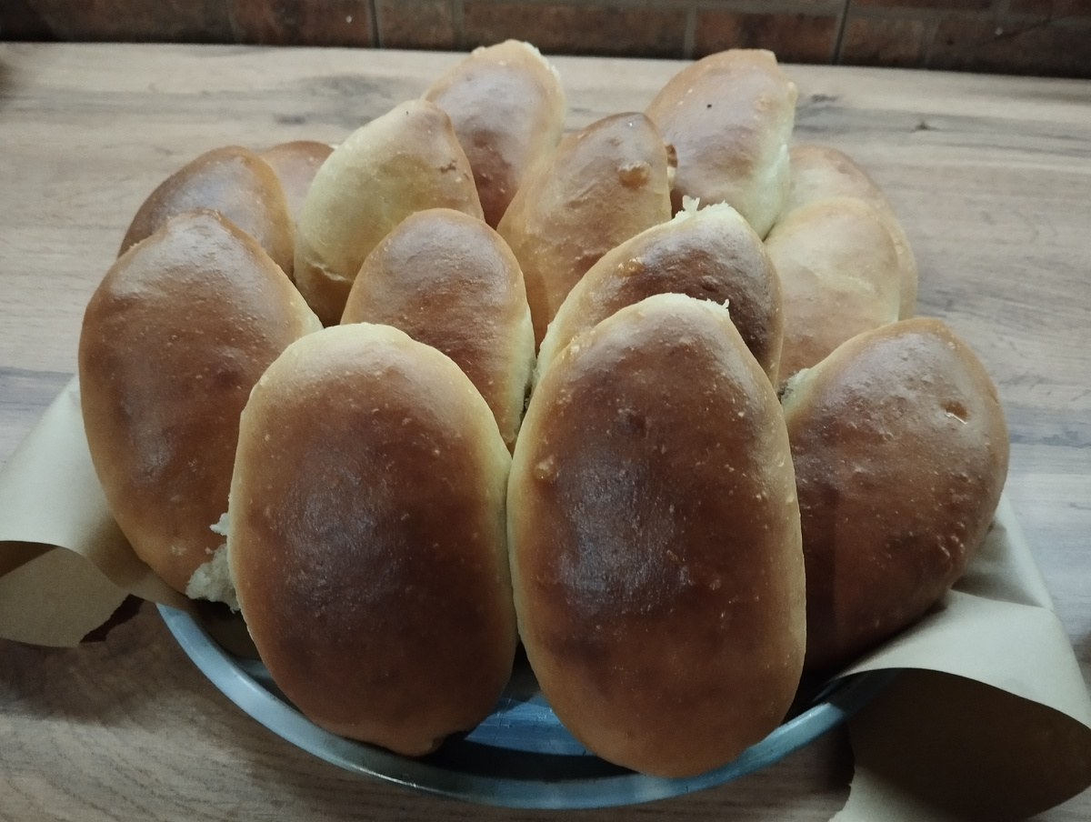 - Расплющить в лепёшку, выложить начинку и сформировать пирожки