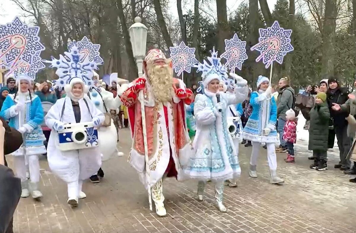 Сказочные персонажи прошли по аллеям парка к своей новогодней резиденции. Деда Мороза и Снегурочку приветствовали жители Калуги, которые пришли на праздник вместе с детьми.