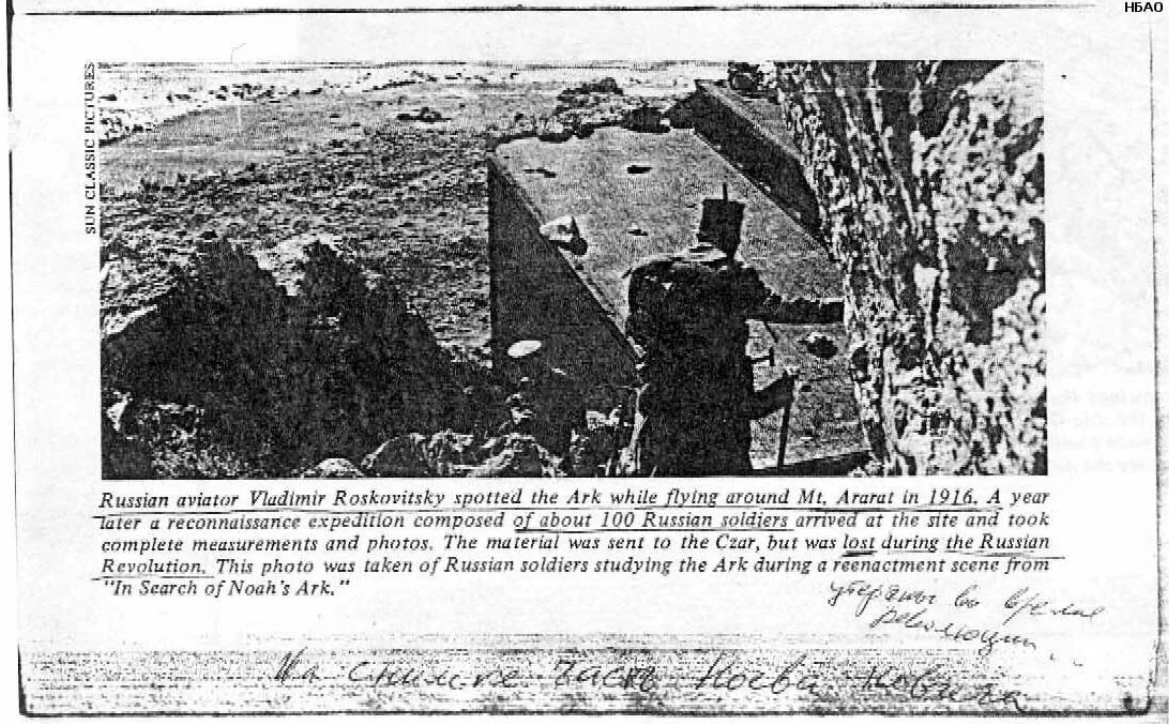 В следующий раз про Росковицкого вспомнил исследовать Эрил Каммингс, который на протяжении многих лет занимался именно изучением тайны Ноева ковчега. Как-то в Нью-Йорке он встречался с полковником Александром Коором, написавшем в 1945 году в одной из эмигрантских газет заметку, где рассказывал, что в 1916 году был командирован к Арарату для защиты перевала. И, находясь там, он слышал расходившиеся по полку слухи о найденном поблизости Ноевом ковчеге. Коор подтвердил уже имевшуюся информацию и даже сказал, что в отряде, занимавшемся изучением объекта, был его друг по фамилии Руянский. Дополнил он своей рассказ тем, что на полу ковчега находили явные следы ржавчины. Коор также утверждал, что на Арарате им были найдены клинописные надписи, описывающие историю Потопа. При этом никакого Росковицкого он так и не вспомнил.