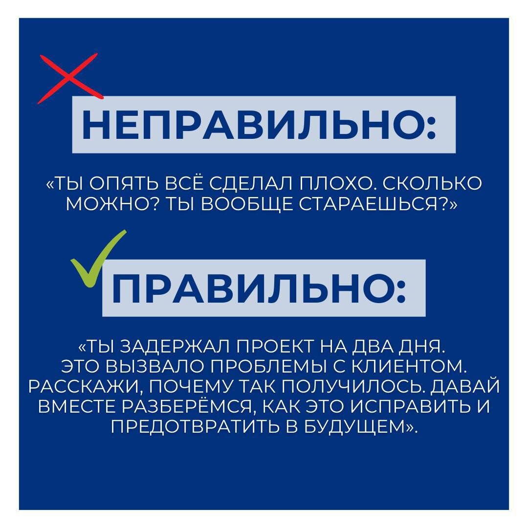 Вместо: «Ты плохо работаешь» — «Задержка в документах вчера вызвала проблему».