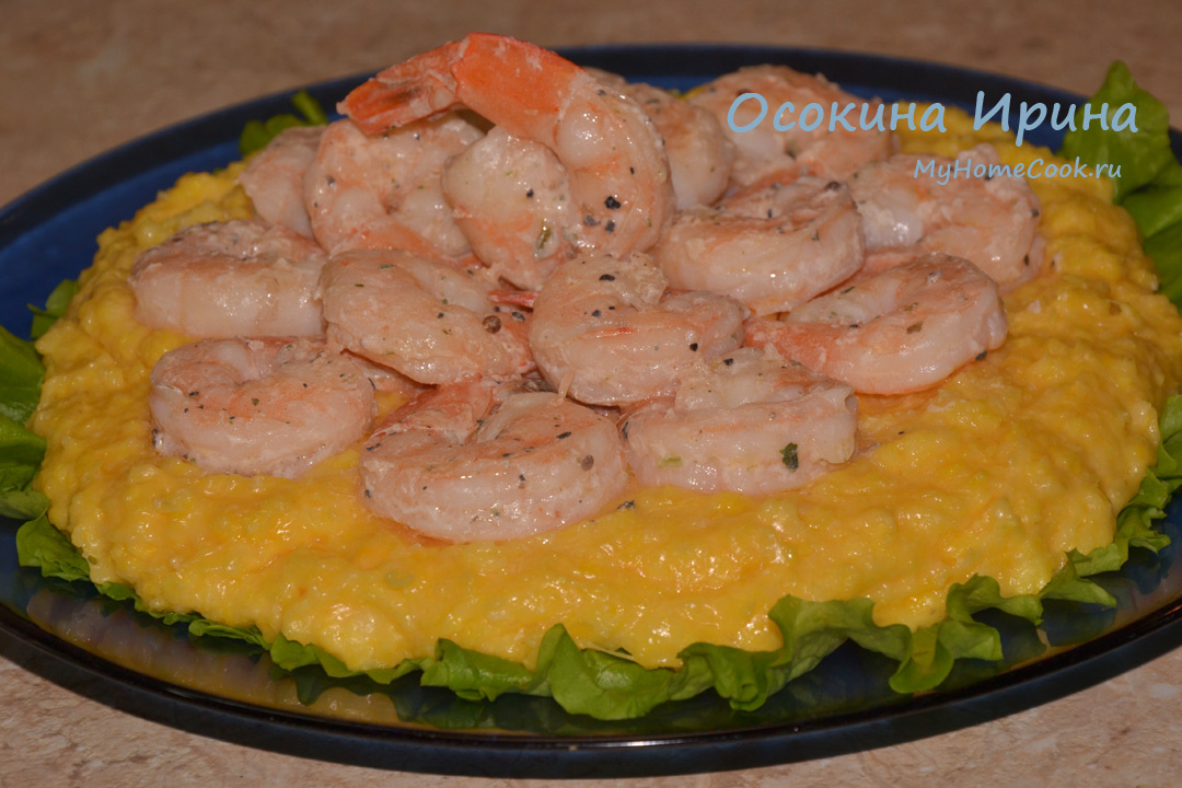 Блюдо американской кухни "Гритс с креветками" интересовало меня давно, но всё не было случая приготовить. Сегодня я решила исправить эту ситуацию. Исторически grits (каши из кукурузной крупы) были основным продуктом питания коренных американцев. У меня получилось вот что: в миску влила 50 мл сливок, соль и перец по вкусу. 1/2 ч.л. сушеного чеснока, 1 ч.л. сушеной петрушки, промешала и замариновала в этом 0,5 кг очищенных крупных креветок (хвостики оставила) на полчаса. В сотейник влила 700 мл воды, посолила, довела до кипения, добавила полтора стакана кукурузных хлопьев, промешала, готовила 3 минут, добавил 50 г сливочного масла, промешала, затем добавила 150 г натёртой на мелкой тёрке моцареллы, промешала как следует, добавила горсть тёртого также чеддера, снова промешала, сняла с огня и оставила под крышкой на несколько минут. В этом время на топлёном сливочном масле обжарила до готовности креветки по минуте с каждой стороны. По тарелкам разложила кашу, поверх - креветки и сразу пода