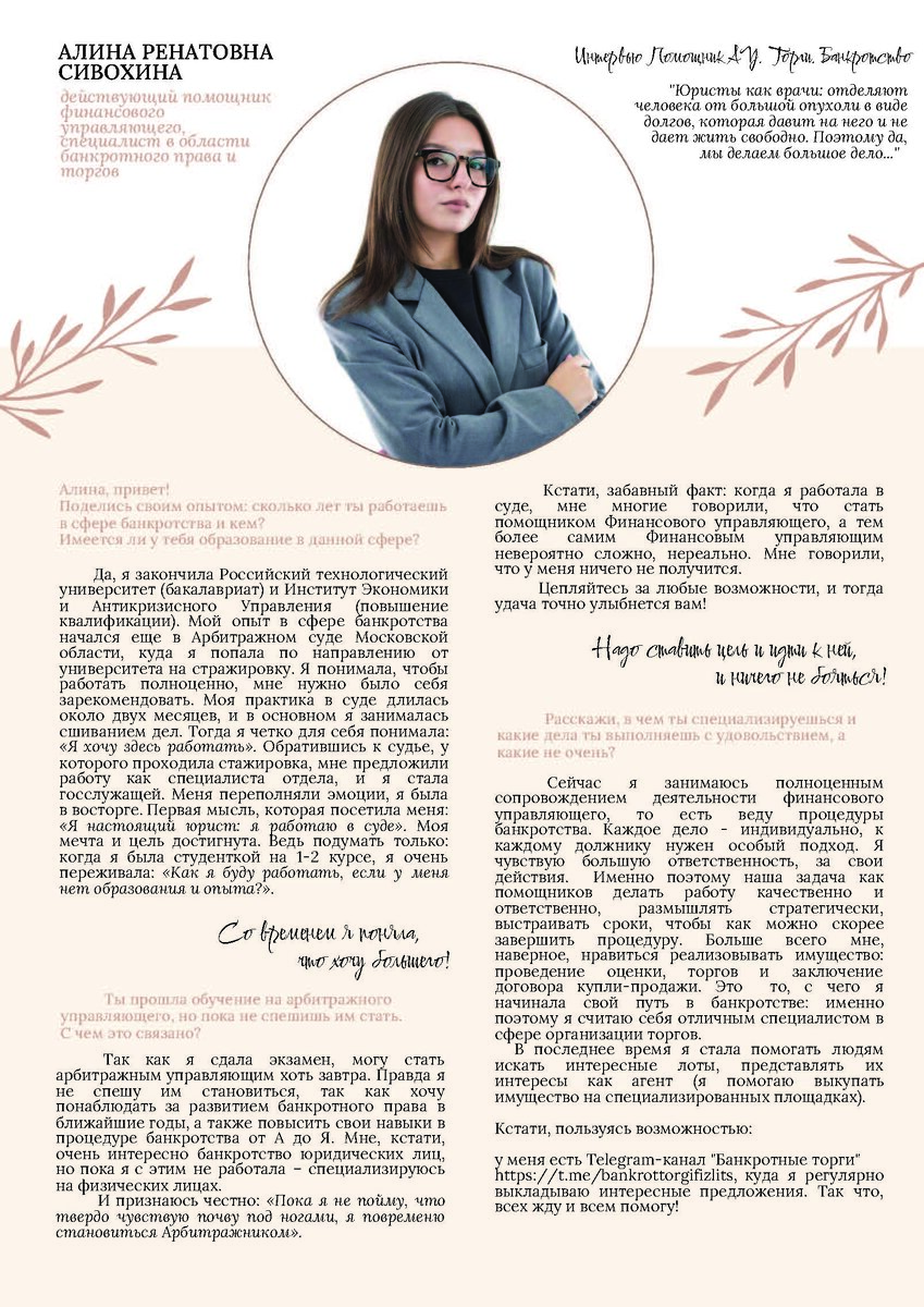 Сегодня предлагаю к Вашему вниманию небольшое интервью, в котором Алина, действующий помощник финансового управляющего, специалист в области банкротного права и торгов, поделилась с нами своей историей.