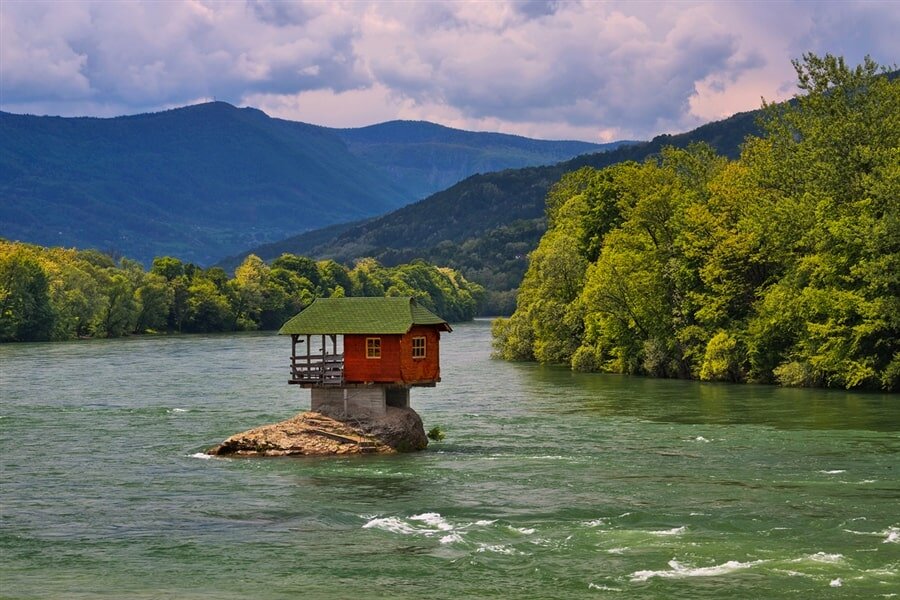 Деревянный дом, похожий на хижину, на скале посреди реки Дрина, недалеко от города Баина-Башта на западе Сербии.