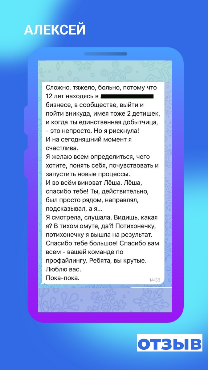Дорогие друзья! С радостью делимся с вами ценными отзывами о работе с нашим экспертом и наставником проекта Алексеем. Его опыт и глубокие знания неизменно вдохновляют участников на достижение новых высот. Алексей не только обладает выдающимися аналитическими способностями, но и умеет создавать теплую атмосферу доверия, что позволяет каждому ощущать себя частью проекта "Меняй Себя". Присоединяйтесь к нам, следите за новыми встречами и обновлениями, а также не упустите шанс поучаствовать в рефлексии 2024 года. Вместе мы сделаем нашу реальность ярче и успешнее!