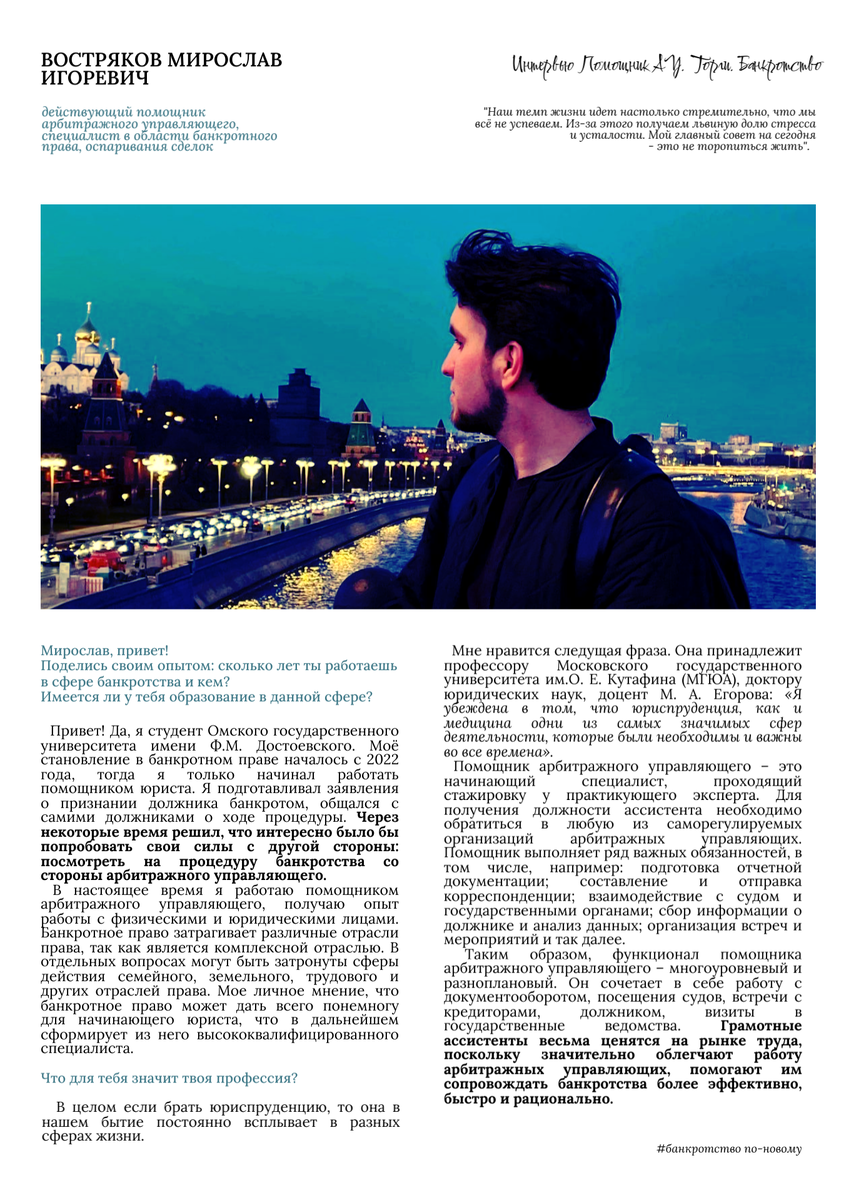 Сегодня предлагаю к Вашему вниманию небольшое интервью, в котором Востряков Мирослав Игоревич - действующий помощник арбитражного управляющего, специалист в области банкротного права, оспаривания сделок поделится своей историей и расскажет, как стал помощником арбитражного управляющего.