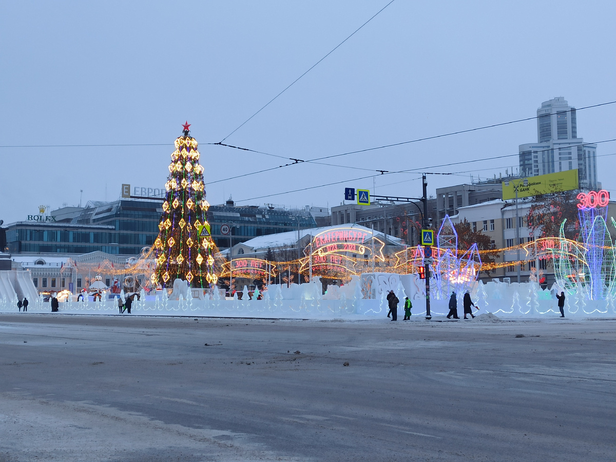 2023 год мы начали с поездки на Урал, а знакомство с столицей Урала - Екатеринбургом - с посещения ледового городка. Возведен он был в самом центре, на главной площади города - площади 1905 года. В том году новогодний городок посвятили трехсотлетнему юбилею Екатеринбурга. Многочисленные ледовые скульптуры были сделаны в стиле сказов Бажова и произведений Мамина-Сибиряка. Тут и лесные звери, и сверкающие кристаллы. В центре городка стояла живая елка с гирляндами, украшенная в советском стиле. Рядом – ледяная крепость, внутри которой можно покататься на детских горках. Сбоку от елки стояла еще одна горка - повыше. Был в ледовом городке и Каменный цветок, олицетворяющий культуру и легенды Урала, — конструкция на металлическом каркасе с яркой светодиодной подсветкой. Планировалось, что праздничная площадка будет радовать горожан и гостей уральской столицы до 15 января, но работу городка продлили еще на неделю - до 22 января. Напротив Ледового городка здание Администрации