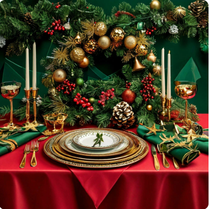 Новогодний стол — это не только место для сбора в кругу семьи и друзей, но и атрибут Нового года, символ надежд и ожиданий на грядущий год. В 2025 году покровителем года станет зелёная деревянная Змея. 31 декабря встретятся деревянный Дракон и деревянная Змея. По китайскому календарю год Змеи наступит 3 февраля. Таким образом, новогодний стол сервируем, чтобы и Дракону угодить и Змею встретить как надо. Хорошо, что они оба деревянные, любят металл (особенно золото), красный и зеленый цвет. Возьмем красную скатерть (можно с зелёными и золотыми полосками, клетками). Красный цвет в 2025 году – цвет денег. Салфетки желательно зелёного (можно красного) цвета, складываем треугольником. Треугольник – знак огня. В центр стола для процветания всей семьи поставим украшение в виде новогоднего венка (композиция из хвойных веток, шишек, елочных игрушек-красных и золотых шаров). В середину венка ставим сахарницу. Можно поставить на стол свечи золотого цвета. Посуду выбираем блестящую металлического,