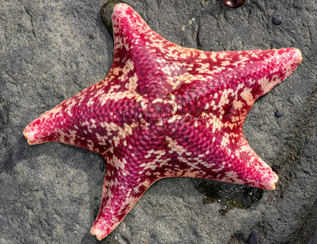 Разрешите представить – звезда-летучая мышь (Patiria miniata), некрупный вид, который водится на тихоокеанском побережье Северной Америки. Вид этот довольно скрытный, часто прячется в щелях между камнями, а потому нечаянно попадает в аквариумы, когда для них собирают "живые" камни.