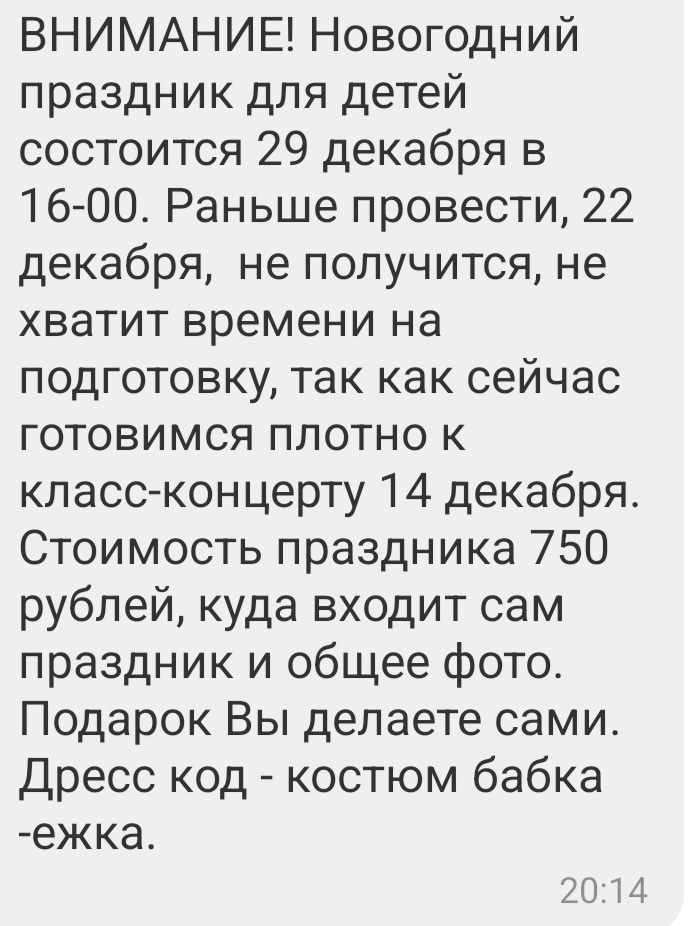 Рассказываю. Сразу отмечу, что никто не догадался. Я и сама была в недоумении поначалу. 7 декабря мы узнали, когда будет праздник и какой костюм готовить👇 😅 Ну, думаю, в бабку ежку мы нарядимся. У меня как раз юбка длинная есть и блузочку найду. Платок чёрный с кистями есть у бабушки. Поэтому образ придумаем👌 Единственное, что за 150 р я заказала на маркетплейсе нос бабы-яги. Но дочка его сегодня благополучно забыла на кровати дома 🤣 Женя возвращаться за носом не стал. Может, оно и к лучшему)) Бабушка успела её пофотографировать с носом дома перед началом праздника. А потом, когда после праздника она пришла её пофотографировал уже Игорь Владимирович 😊 За подарок София рассказывала деду морозу моё стихотворение про снеговика) Не скажу, чтобы дочка была в восторге от этого праздника. Прошёл и прошёл. Фотографии на память останутся. Конфетами мы уже объелись 🙈 До нового года всего ✌️ дня