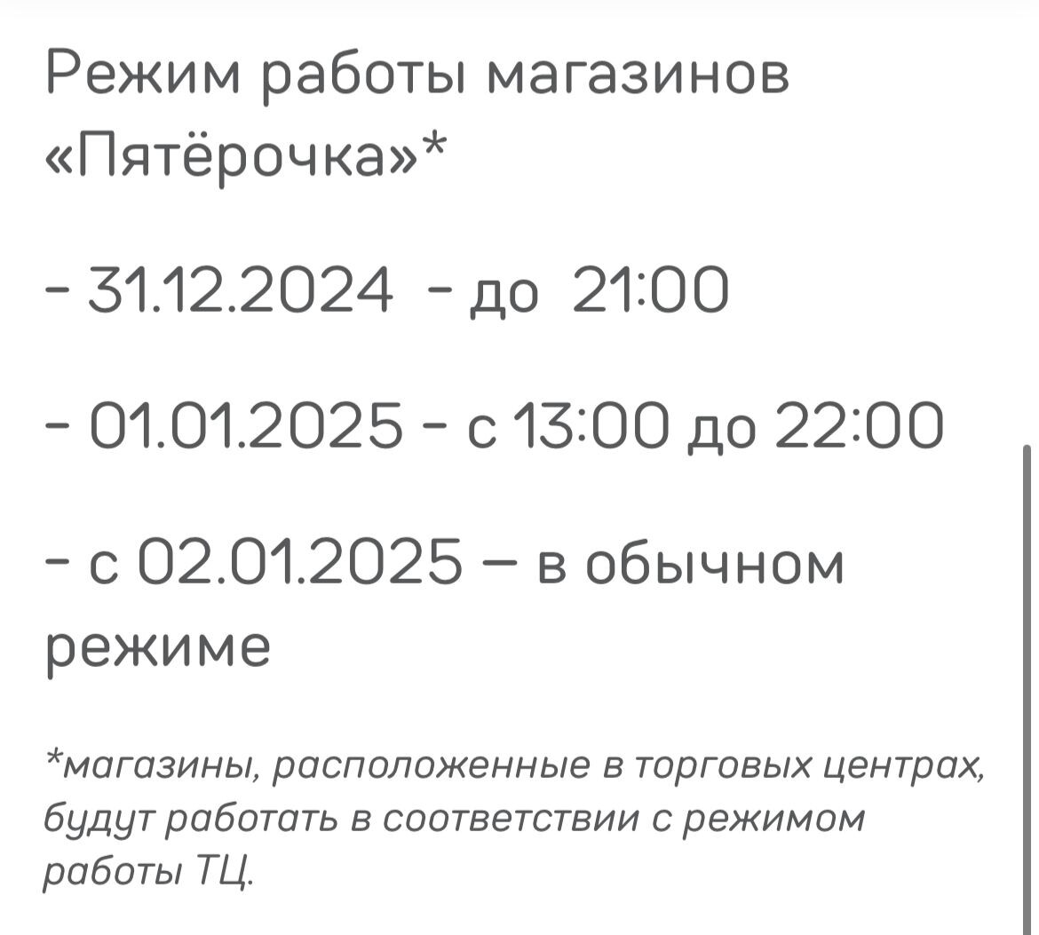 Так, сеть «Пятерочка» вплоть до завтрашнего дня 30 декабря будет работать по привычному графику – с 00:00 до 00:00.