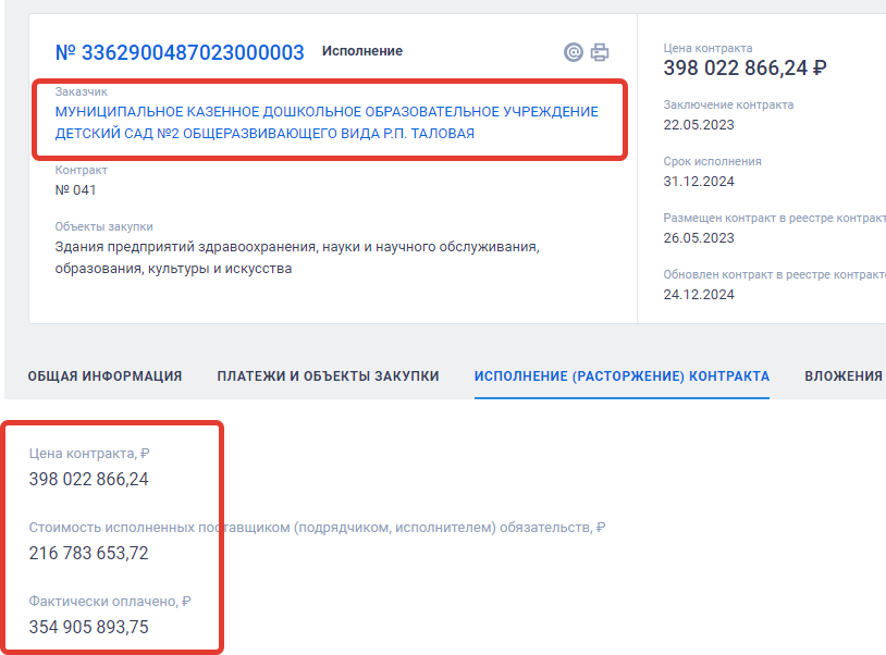 Грубо нарушены сроки выполнения работ по строительству объекта «Детский сад по проезду Буденного 29б в р.п. Таловая Таловского района». Согласно контракту, подписанному в мае 2023 года, здание для дошкольного образовательного учреждения должно быть сдано подрядчиком - воронежским ООО «СМУ №61» - до 1 июня 2024 года. Отсутствие официальной информации на сей счет – об окончании строительства детского садика за 400 млн рублей - и ряд косвенных данных свидетельствуют о серьезных проблемах на этом объекте. При этом вопросов с бюджетным финансированием подрядчика не было. Из областного и муниципального бюджета ему было фактически выплачено почти 355 млн рублей. Стоимость исполненных работ ООО «СМУ №61» за полтора года, по данным из открытых источников, составила 216,7 млн рублей. Можно сказать, что гендиректор и единственный учредитель ООО «СМУ №61» Сергей Куликов получил из бюджета области беспроцентный кредит в 139 млн рублей и распоряжается им по своему усмотрению. А в банках сейчас вполн