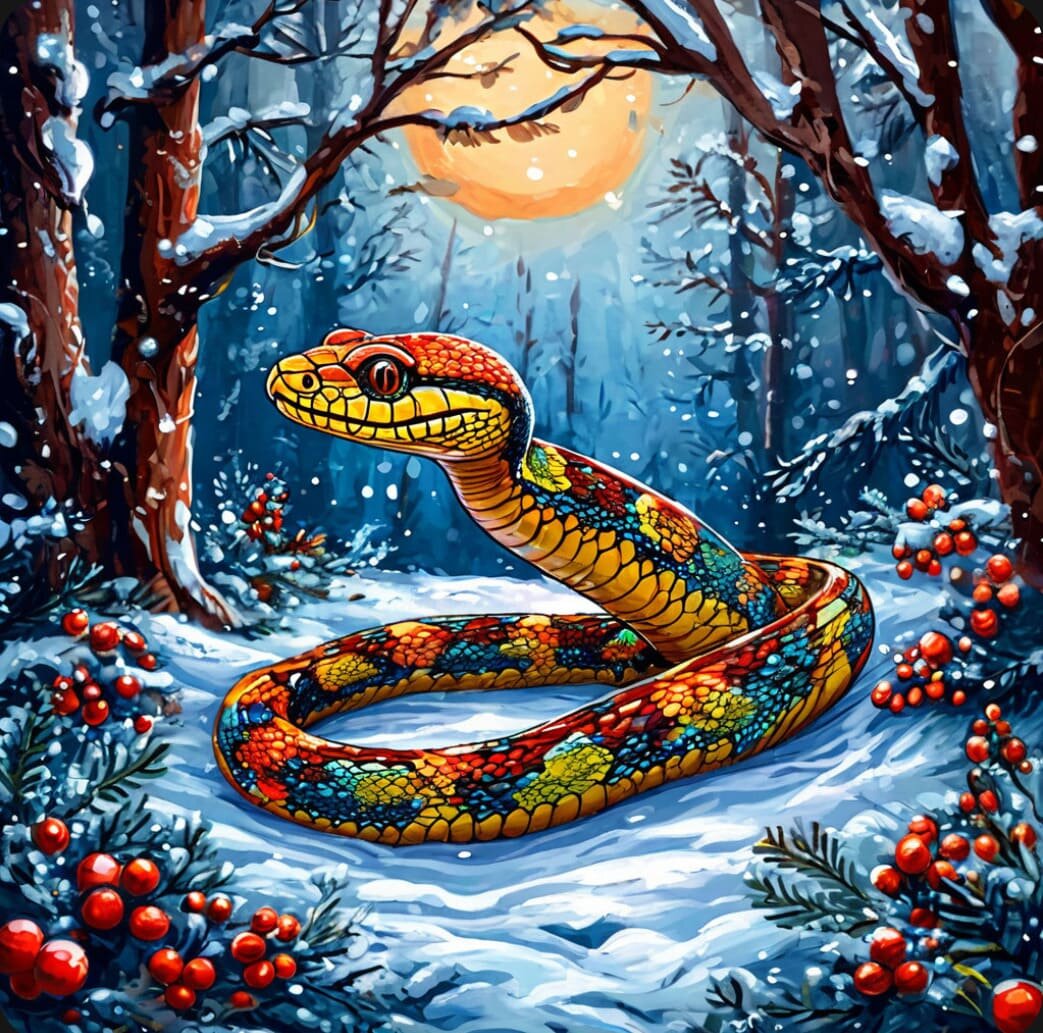 В густом, заколдованном лесу, покрытом снегом, жила-была умная и ловкая змейка по имени Свистулька. В отличие от других змей, которые впадают в зимнюю спячку и не любят холода, Свистулька обожала волшебную атмосферу Нового года; и ни за что бы не проспала такое чудо. Ей нравился сверкающий иней, мерцающие огни и предвестие новых надежд. В этом году она решила отправиться в приключение, чтобы порадовать лесных обитателей и отпраздновать Новый год так, чтобы он запомнился. Накануне Нового года Свистулька скользила по снегу, её изумрудно-зеленая чешуя поблескивала в лунном свете. Путь неблизок-недалек, и вот наша путешественница у норки друга кролика, Хрумки. Хрумка сидел мрачный — он потерял свой любимый колокольчик в форме морковки, подарок своей бабушки. — Не волнуйся, Хрумочка, — сказала Свистулька, взмахнув хвостом. — Я найду твой колокольчик до того, как ты выйдешь из своего домика! Только погреюсь немножко. Змейка согрелась как следует и, выскочив из норки, пустилась на поиски д