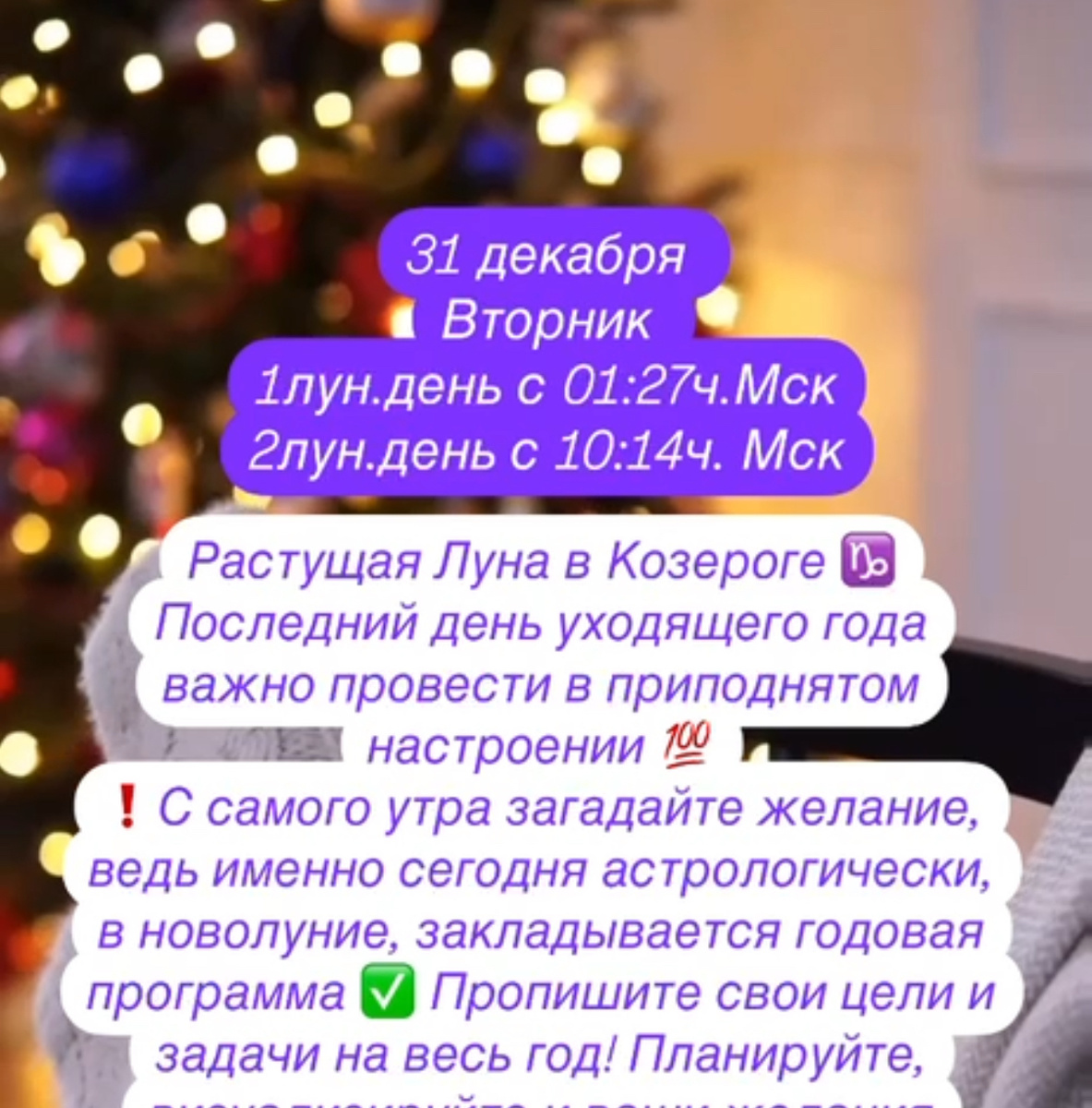 Растущая Луна в Козероге ♑️ Последний день уходящего года важно провести в приподнятом настроении 💯 ❗️С самого утра загадайте желание, ведь именно сегодня астрологически, в новолуние, закладывается годовая программа ✅ 🎄Пропишите свои цели и задачи на весь год! Планируйте, визуализируйте и ваши желания обретут силу исполнения🙌 ♥️А я поздравляю Вас с наступающим Новым годом и желаю вам исполнения самых смелых и заветных желаний 🙏 Сны - вещие ❌стрижка ❌покупки #гороскоп #астрология #луна #овен #телец #близнецы #рак #лев #дева #весы #скорпион #стрелец #козерог#гороскоп #астрология #луна #овен #телец #близнецы #рак #лев #дева #весы #скорпион #стрелец #козерог