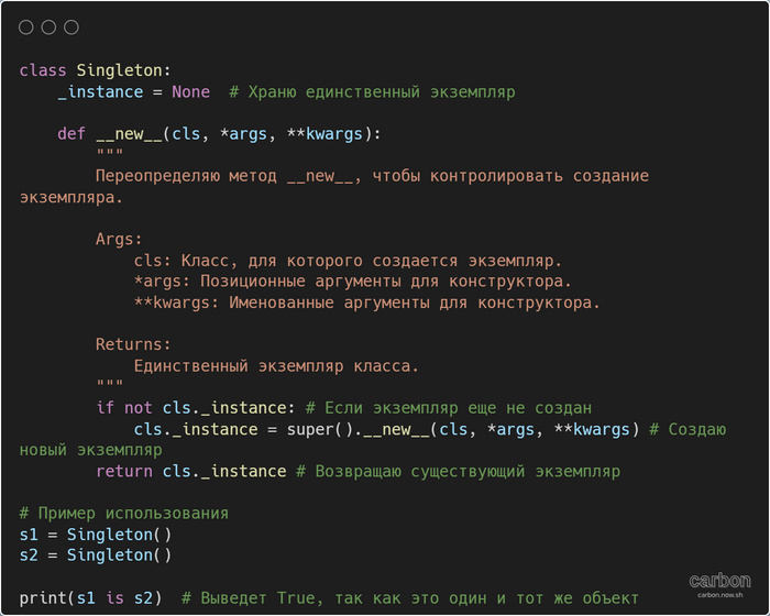 В Python, синглтон – это шаблон проектирования, который гарантирует, что у класса будет только один экземпляр, и предоставляет глобальную точку доступа к этому экземпляру. Это значит, что при попытке создать новый объект этого класса, ты всегда будешь получать один и тот же объект. Синглтоны полезны, когда нужно ограничить количество экземпляров класса, например: Преимущества синглтона: Недостатки синглтона: Несколько способов реализации синглтона в Python. Когда использовать синглтон? Оригинала статьи в GIT Другие шпаргалки: Серия 101 игра на python с разбором кода. Портирую классические игры на язык python с добавлением искусственного интеллекта. Серия информатика, с изложением терминов
