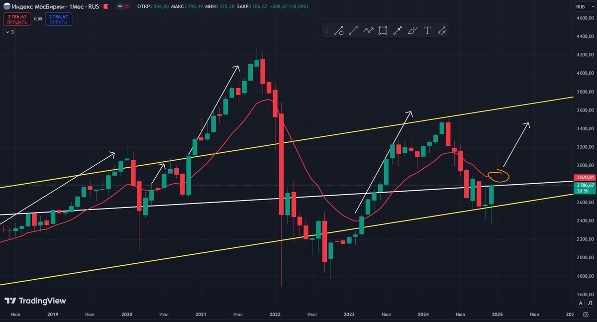 Всем доброго воскресного вечера друзья🤝😊 Выходные, а значит настало время нашей еженедельной рубрики, в которой мы смотрим акции на месячном таймфрейме. С прошлых выходных остались еще неразобранные акции. Вот их мы сейчас и посмотрим. Не забывайте ставить реакции и подписываться на мои: Телеграм канал Группа МБО Закрытый канал "Моя торговля в МБО" #IMOEX Месяц Еще раз посмотрим индекс, который уже делает изменения в сторону восходящего тренда. Во-первых мы пробили максимум ноября и делаем сейчас внешнюю свечку. Пробой максимума по сути дает сигнал на покупку актива в долгую, но я предпочитаю увидеть цену выше скользящей 12МА. Пока закрепления нет на этом графике. Было бы идеальным увидеть индекс выше скользящей при небольшой волатильности. То есть хорошей растущей свечкой без хвостов пробили спокойно скользящую и вышли в положительную зону. Там уже смело можно работать. Январь нам покажет в какую сторону мы будем торговать в итоге. Не является индивидуальной инвестиционной реком
