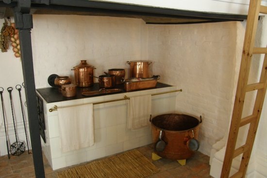 Пол на кухне был достаточно холодным, и для удобства повара использовались тростниковые половики. Интересно, что рядом стоит раскладная кровать, поскольку венценосная особа могла пожелать поесть в любое время суток, и повару часто приходилось ночевать в Банном корпусе.