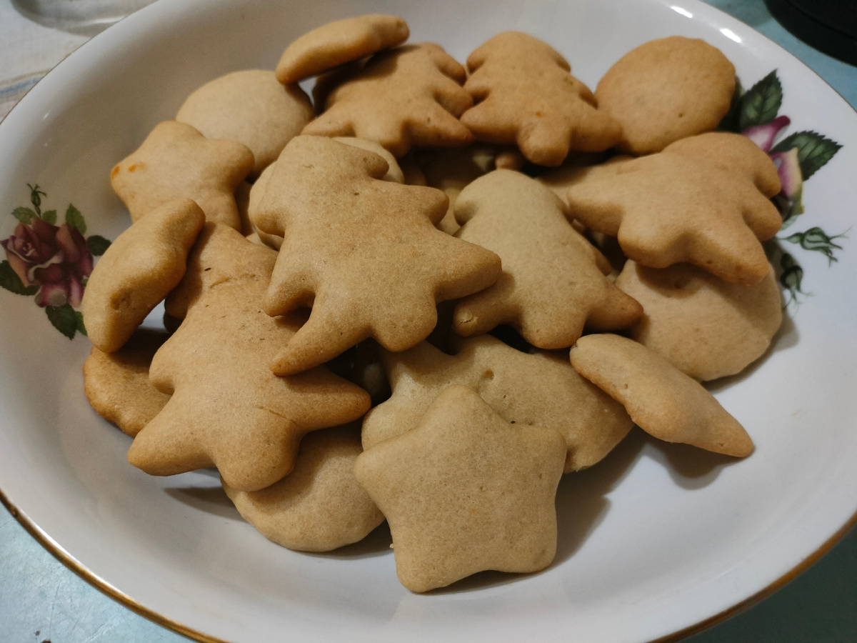 Масло растительное — 100 мл Мёд — 4 стол. ложки Яйца — 4 шт. Мука — около 4-ëх стаканов Сода — 1 чайная ложка без верха Имбирь молотый — 1 чайная ложка без верха 1. Помещаем в кастрюльку масло и мёд. Нагреваем, чтобы мёд растаял. Я брала миску и ставила в микроволновку. Способ не важен, главное — результат. 2. Даём немного остыть и добавляем яйца. 3. Немного сбиваем всё вместе. Я пользовалась для этого вилкой. Добавляем соду и снова промешиваем. 4. Насыпаем имбирь, смешиваем с ним. 5. Всыпаем муку. Её может понадобиться разное количество. Постепенно добавляем и замешиваем тесто. Я брала 3 стакана цельнозерновой муки и 1 стакан рисовой. Вам может понадобиться меньше муки. Тесто должно быть эластичным и податливым. Если переборщить с мукой, печенье будет сухим. Чтобы оно не липло к рукам, смажте их маслом. 6. Ставим тесто в холодильник. Тем временем включаем духовку, готовим место для раскатки, смазываем форму, в которой будем выпекать печенье. 7. Раскатываем тесто толщиной ~