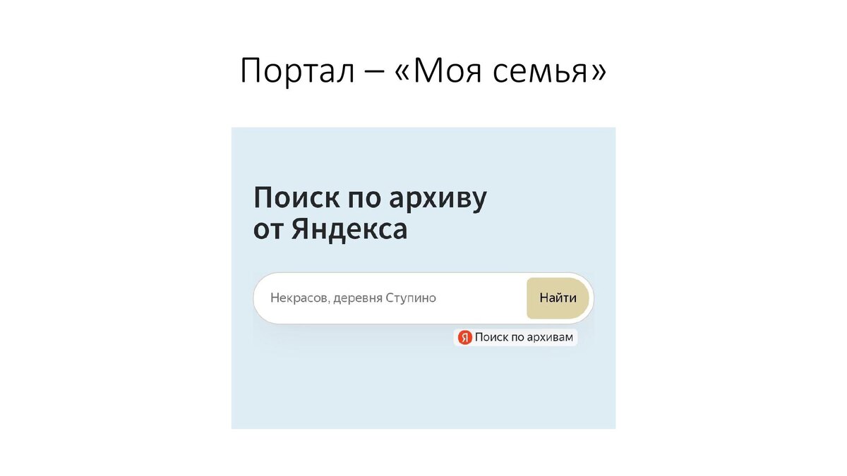 Благодаря такой технологии, на портале «Моя Семья» появилась функция автоматизированного поиска – «Яндекс поиск по архивам». Достаточно ввести фамилию и имя — система сама предложит варианты документов, где встречаются эти данные.
