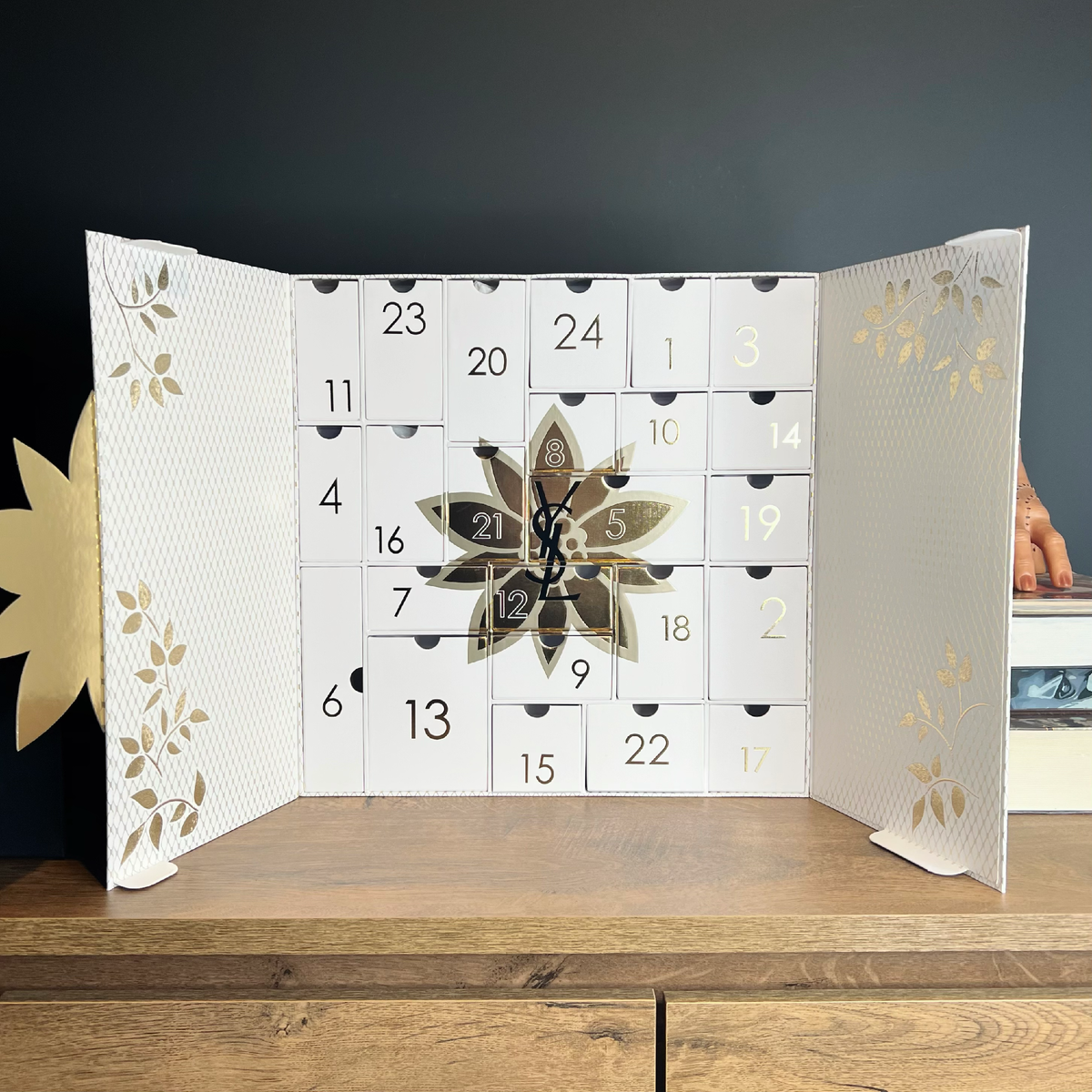 В этом году мне преподнесли неожиданный подарок. Я получила люксовый адвент-календарь Yves Saint Laurent. Стоимость календаря сложно рассчитать. Дело в том, что к нам в продажу они не поступали. Заказать можно было только через байеров в других странах. Они оперативно перед новым годом ходили по магазинам и отправляли сюда.