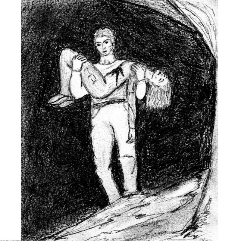 Тут же его как ударило изнутри. Она ранена! Резко обернувшись к ней, он увидел её бледное лицо, полузакрытые глаза и ощутил эту её острую жгучую боль в груди, как свою собственную. Он посмотрел ей на грудь, на сером лётном комбинезоне растекалось большое алое пятно её крови. Боевой лазерный луч катера пробил Лизу насквозь и задел Эйнора. Он подхватил её на руки, невзирая на сильную боль от раны в своём боку, и побежал с Лизой обратно в пещеру. Сзади по нему в темноту пещеры уже стрелял лазером катер, который висел у входа в пещеру, но он в Эйнора не попал.