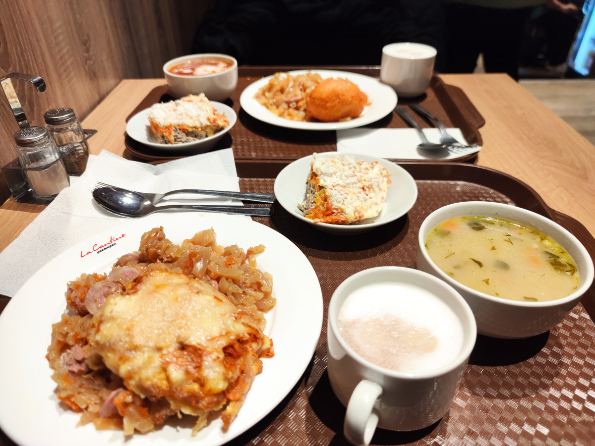 Не стала я смешивать в одну статью духовное и земное 😊 Но как бы там ни было, кушать хочется регулярно и даже несколько раз в день. В центре Питера, где мы живем, очень много разных кафе и ресторанов. На любой вкус и кошелек. Кстати, все они заполнены людьми. Может потому что вчера был выходной да еще и предпраздничый день. А может тут всегда так. Спасибо за ваши советы. Они нам помогли. Обедали мы в Столовой номер 1. Вначале вообще хотели пойти или в Бургер кинг, или в Ростикс. Но захотелось обычной домашней пищи. Было два часа дня и народа в Столовой было очень много. Я даже опасалась, что не найдем свободный столик. Но зря опасалась. Взяли мы с мужем по супу: я - рассольник, муж - борщ. На второе оба захотели тушенную капусту, только я с треской, а муж с киевской котлетой. А да, еще взяли по салату. На вид он похож на Мимозу, но оказался с печенью. Ну и по чашке кофе. Вполне съедобно. Вот только почему-то все не горячее. Вроде так много посетителей. Сметают все быстро. Когда