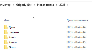 Давным-давно меня научили очень интересным образом структурировать файлы на компе. Я каждый год создаю новую папку, называю её 2025 (или другой год) и создаю те папки, которые нужны в данный момент.